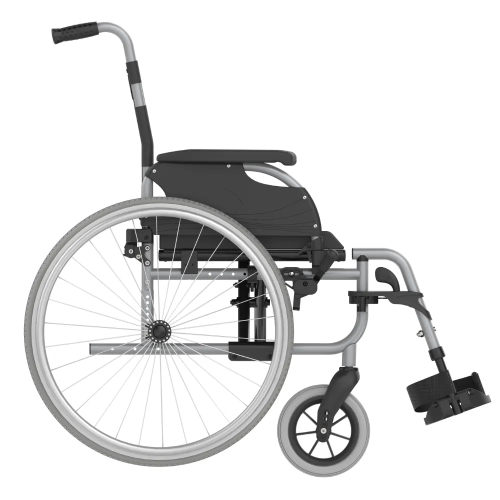 • Manual (self-propelled) - Back wheels need fitting - Back wheels 24-inch (solid) with push rims and quick-release axles - Front wheels: 8-inch fitted (solid) - Swing-away Legrest with footplates and heelstraps